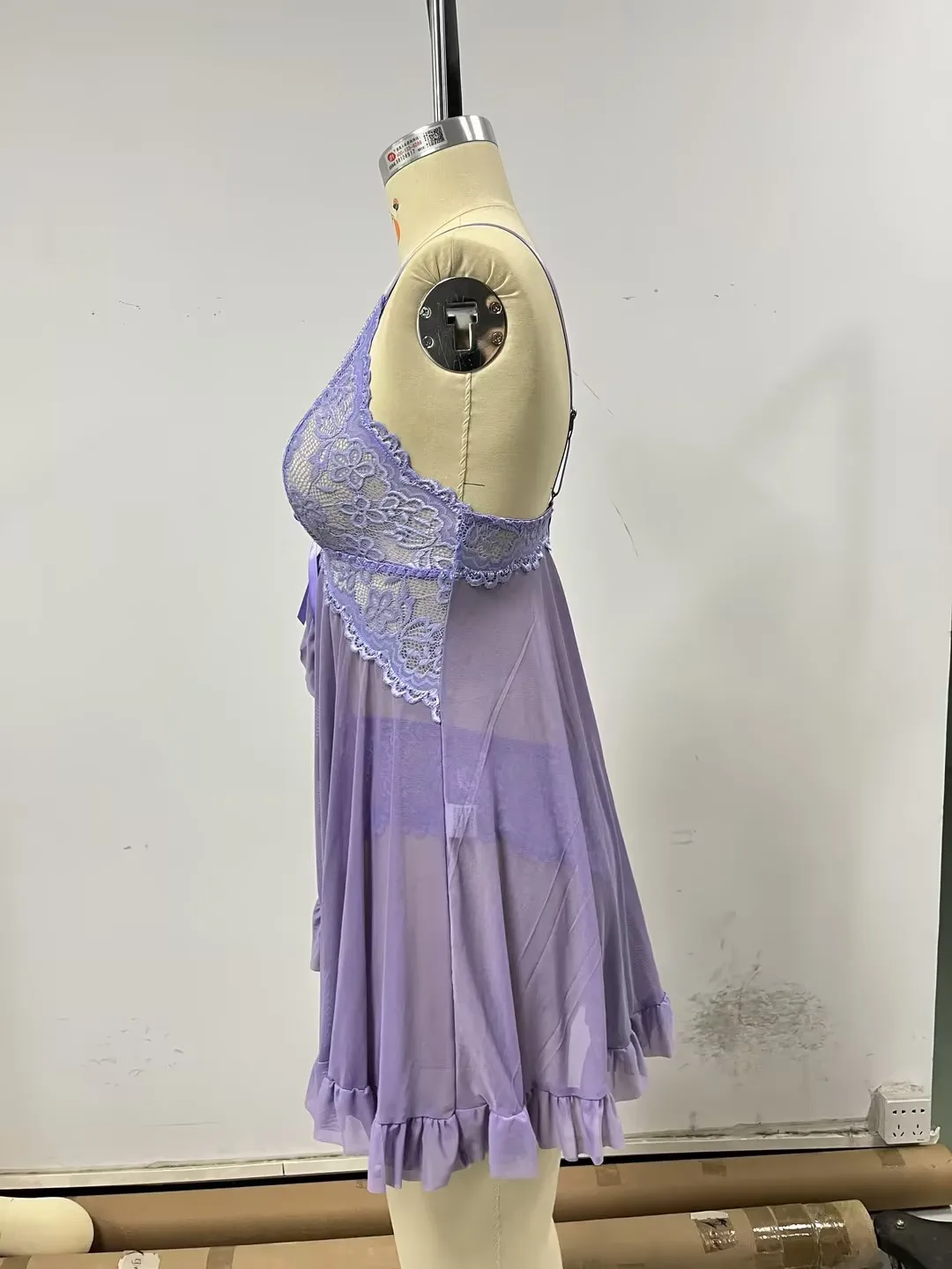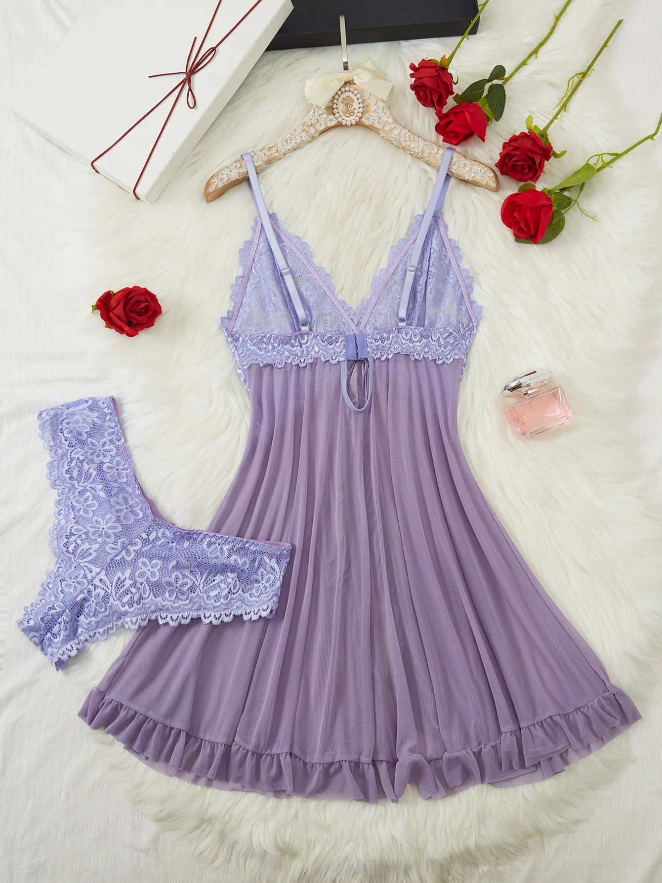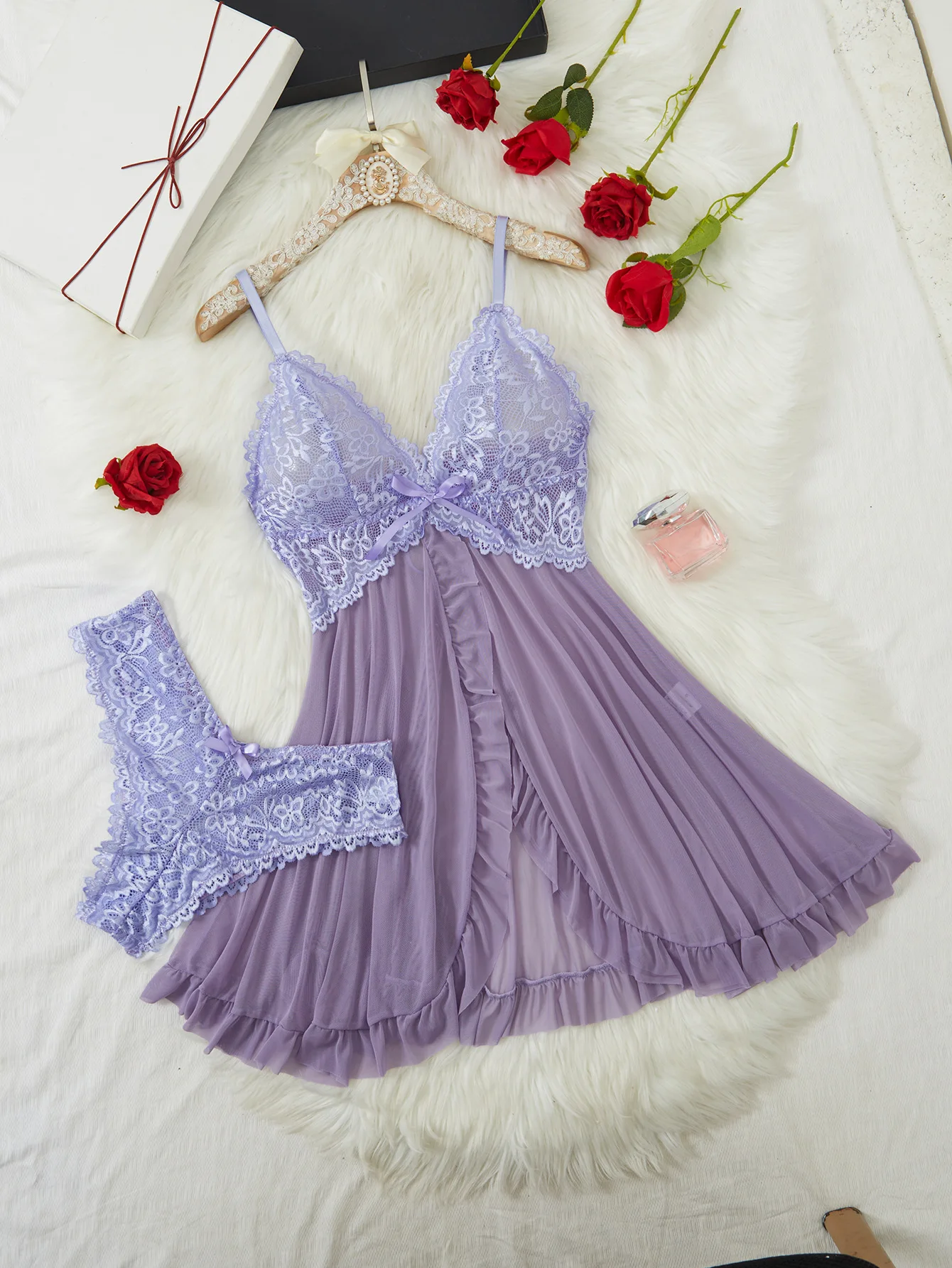 2-pcs sexy pink lace pajama set transparent split nightgown dress with underwear thin thong elegant women's pajamas
