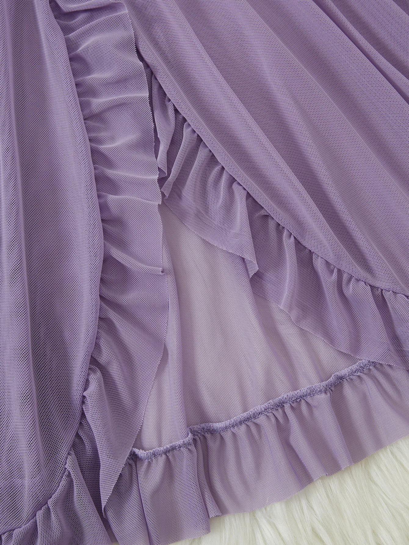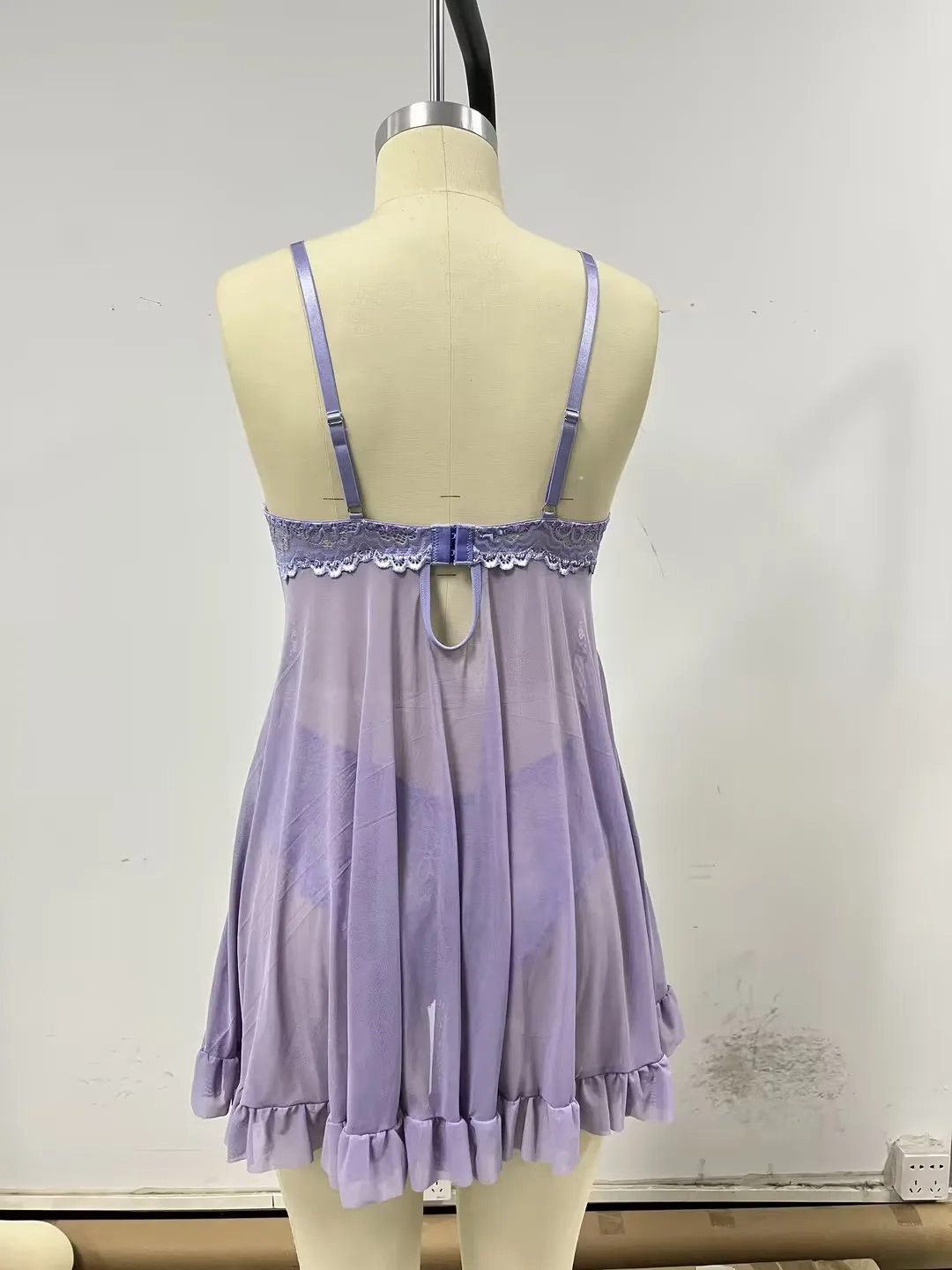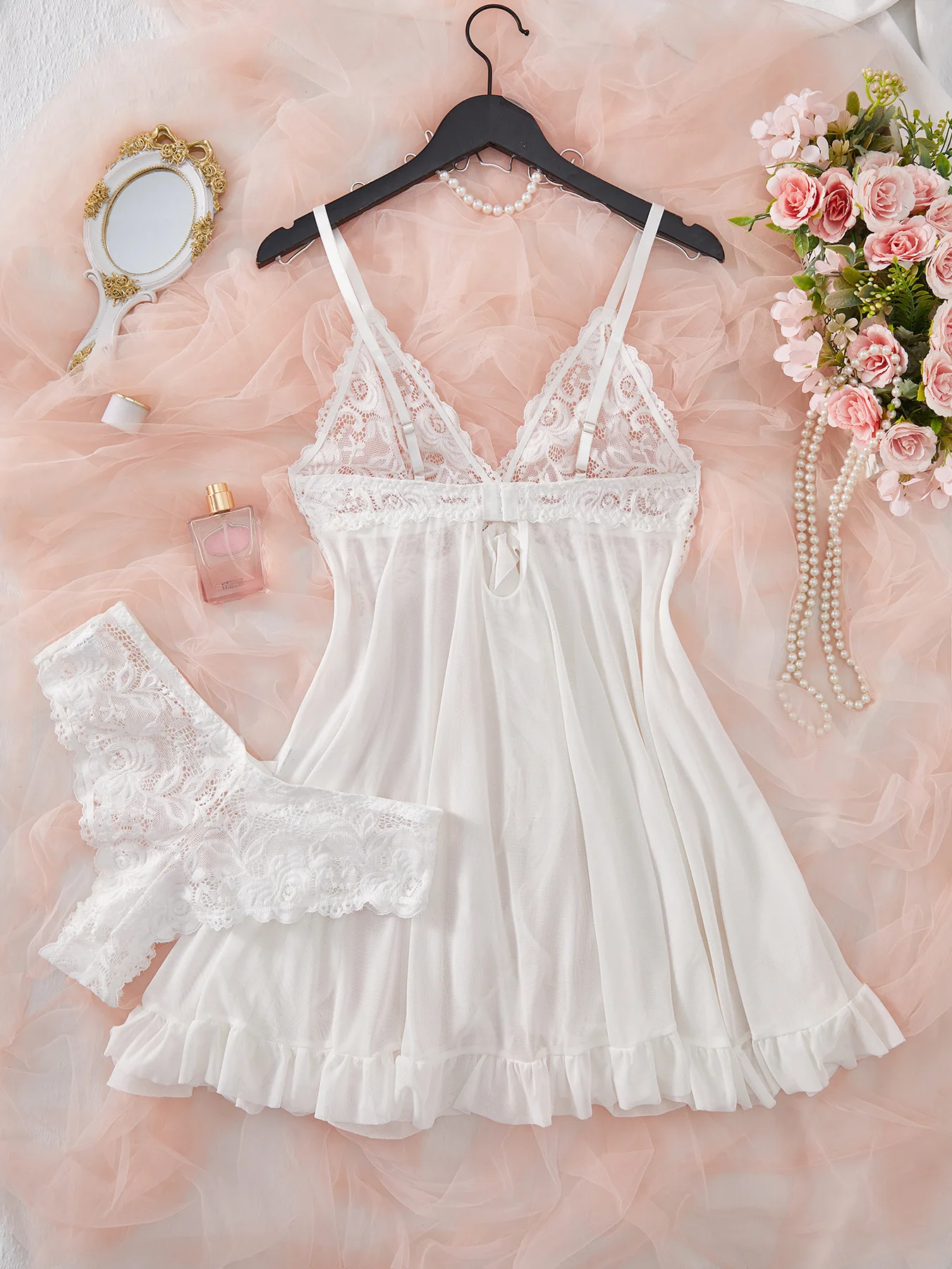 2-pcs sexy pink lace pajama set transparent split nightgown dress with underwear thin thong elegant women's pajamas