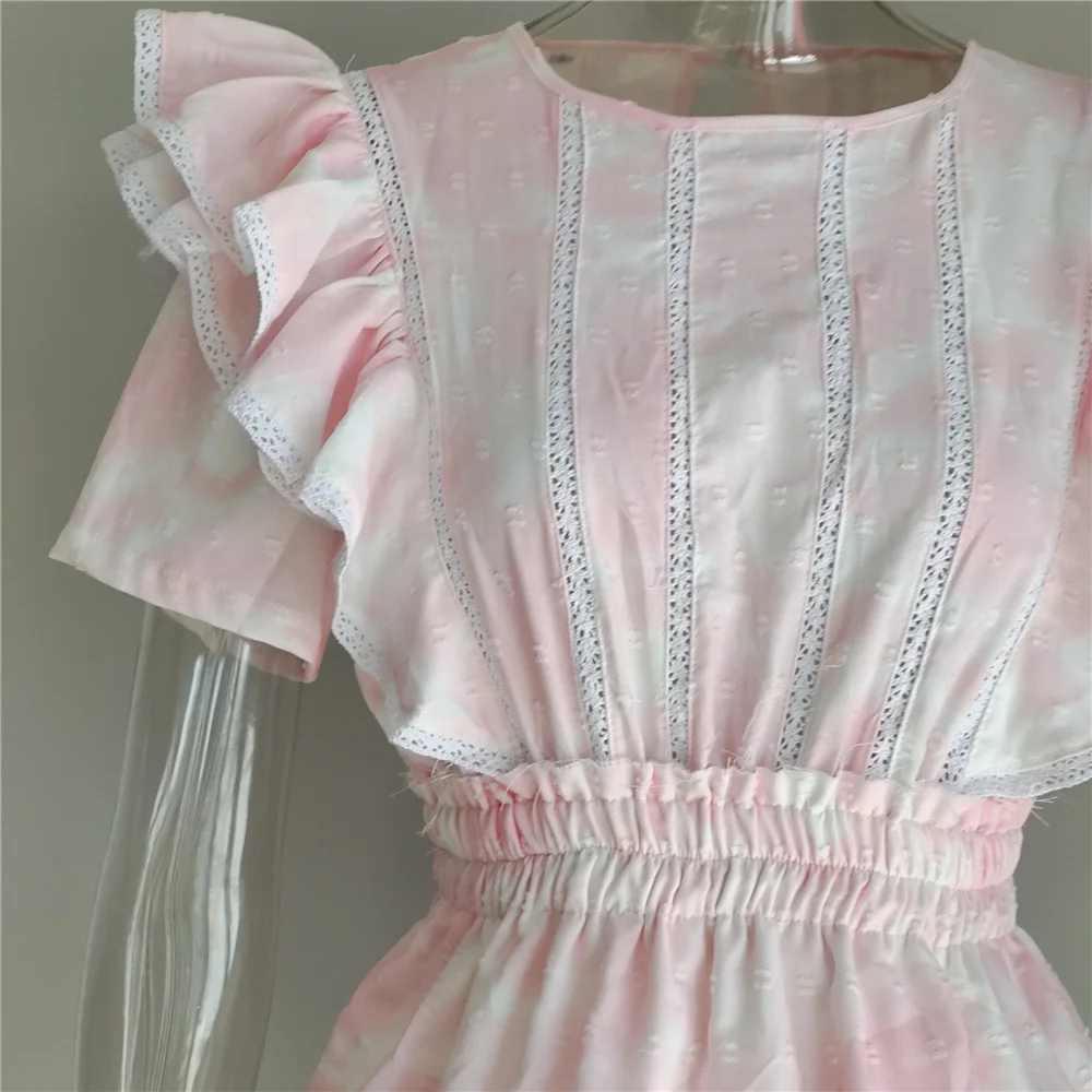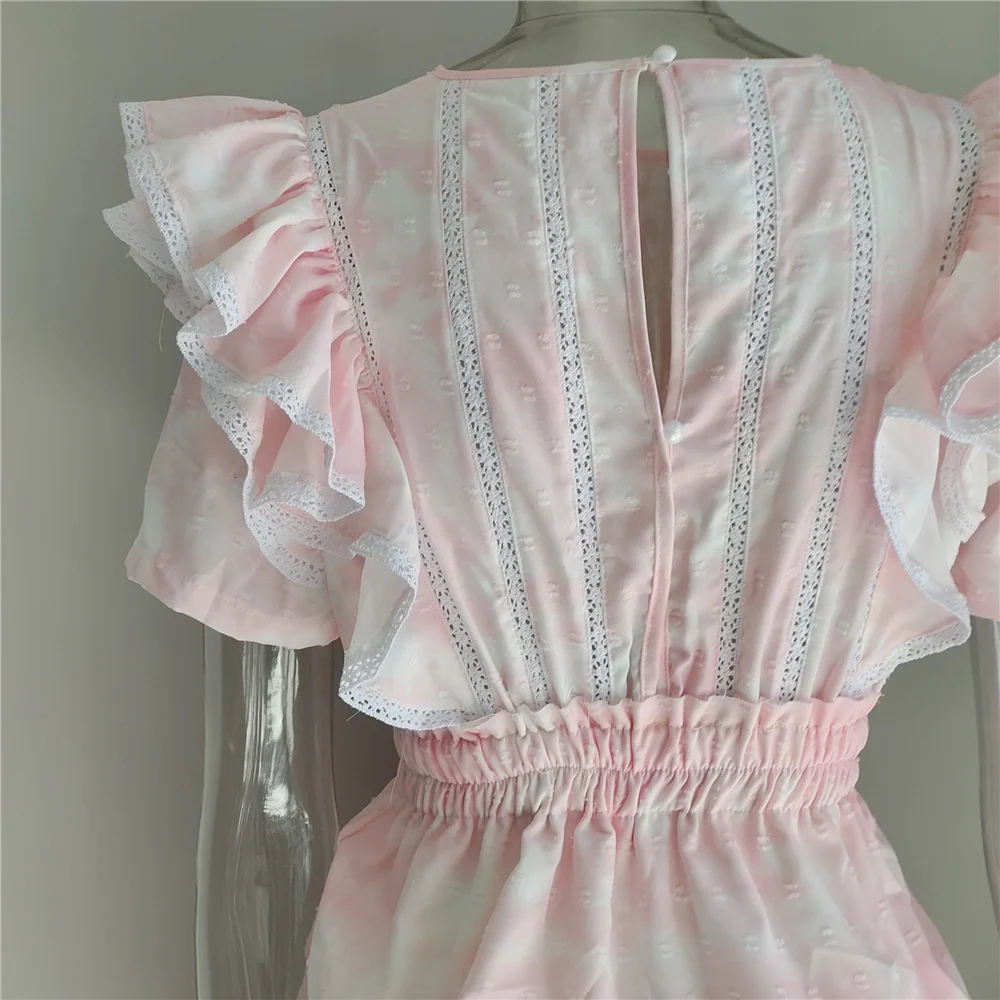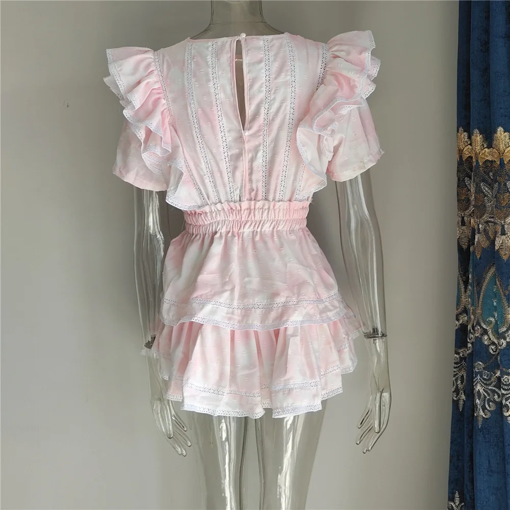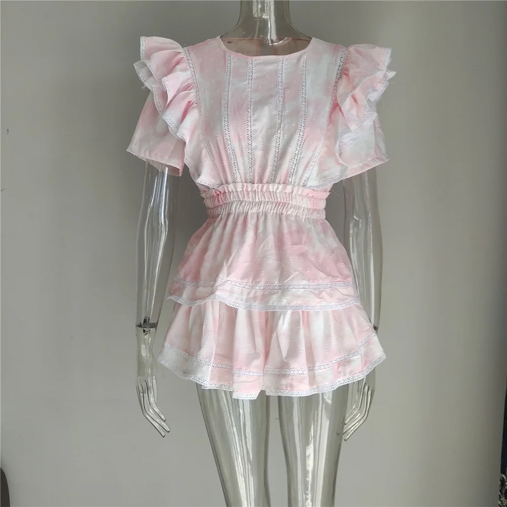 2022 Summer Short Sleeve Vocation Women White Mini Dress Holiday Lace Ruffled Dress Pink